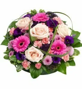 A funeral posy is a small, round floral arrangement often displayed on a table, at the graveside, or near the coffin. Its circular shape symbolises eternity and the unbroken life cycle, making it a meaningful tribute to someone who has passed away.