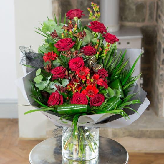The Crimson Blush Flower Bouquet is a bold and sophisticated arrangement designed to make a lasting impression. This stunning modern front-facing bouquet is filled with rich, velvety red roses and luscious seasonal berries, creating a show-stopping piece that exudes elegance and passion. Full of texture and intricate detail, Crimson Blush is the ultimate gift for that extra-special someone.