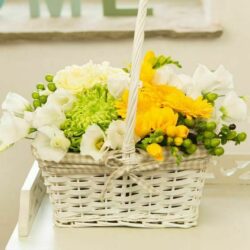 The delicate freesia adds a sweet, uplifting fragrance, while the sunny carnations provide texture and durability, ensuring your arrangement remains beautiful for days. Presented in a stylish basket with a modern edge, this floral creation is perfect for adding a touch of sophistication to your home or sending as a thoughtful gift.