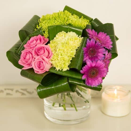 Add a splash of colour and style to any occasion with our Quattro Flower Bouquet, a modern and contemporary arrangement that’s full of fun and elegance. This stunning hand-tied bouquet features a vibrant mix of zesty lime shades, hot pink blooms, and muted purple tones, creating a bold yet balanced design that’s guaranteed to impress.