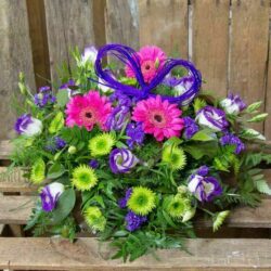 The Touch of Purple Posy Arrangement is more than just a floral display—it is a thoughtful gesture that speaks volumes when words fall short. Its simplicity, combined with its vibrant accents, makes it a comforting and uplifting tribute, perfect for funerals, memorial services, or as a personal expression of sympathy.